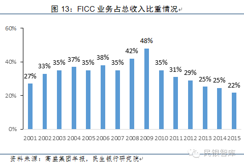 从重资本向轻资本转型。为满足沃克尔规则要求,高盛逐渐剥离方向型交易的自营业务,重资本为主的自营业务规模大大缩减。业务结构从高风险的交易业务向轻资本的中介业务转型。金融危机前,高盛机构销售交易和本金投资是其支柱业务,2007年的收入贡献高达68%,传统投行服务和资产管理业务的收入占比不足30%;金融危机后,资本中介型的机构客户服务成为高盛的业务支柱,重资本的投资业务占比直线下滑,2015年底高盛机构客户服务的收入占比为45%,投资借贷业务收入占比下滑至约16%的水平。