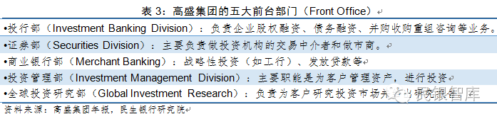 在高盛内部,五大前台部门分别是投行部、证券部、商业银行部、投资管理部、全球投资研究部,这些部门共同组成了服务客户的四大业务条线。