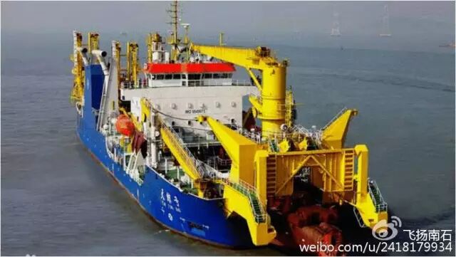 由中交天航局投资、招商重工(深圳)公司建造的天鲸号自航式吸挖泥船,船长127.5米,宽23米,吃水5.5米,最大挖深30米,装机功率超过2万千瓦,亚洲第一,世界第三。南海吹沙填海用的就是它,你懂的。