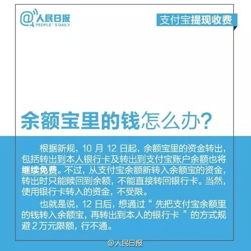 来源:人民日报10月12日起,支付宝将对个人用户超过免费额度的提现收取0.1%的服务费,每人累计有2万元基础免费额度。对于已经把支付宝作为生活一