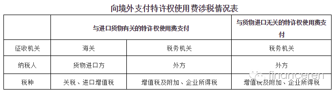 下表列示了税务机关和海关对特许权使用费的征税情况。