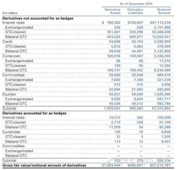 下表是高盛2014年在各类衍生品市场进行对冲和非对冲交易的衍生品分类统计。