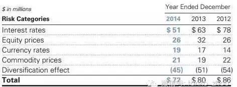 敏感性分析表明,高盛衍生品增加信用利差(交易对手和高盛自己的)一个基点,在2014年12月和2013年12月分别获得了三、四百万元(包括对冲)的收入。