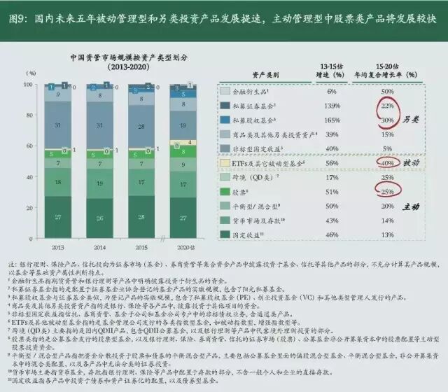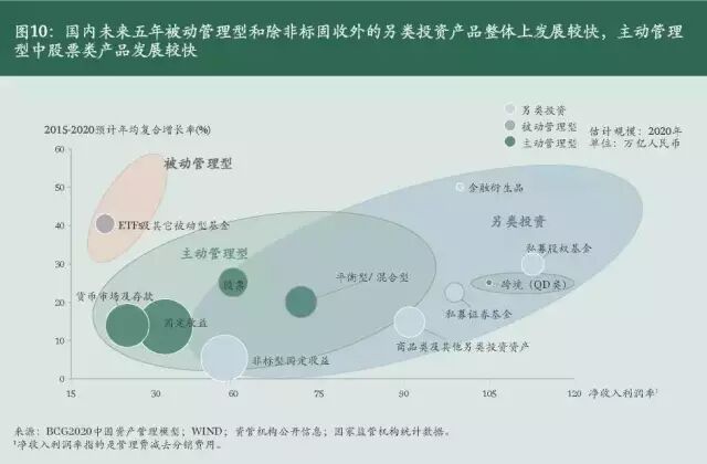 从图9可以看到,根据BCG的预测,主动管理型产品中,股票类产品的增速最为突 出,2015-2020年均复合增长率超过25%。以ETF为代表的被动管理型产品增速更高,2015-2020年均复合增长率达到40%。股票类产品和被动管理型产品的发展主要得益于证券市场 基础资产池的做大,包括国内资本市场,尤其是股票市场的融资功能有望进一步强化;注册制的推出有望加速中国优质企业在国内上市;混合所有制的深入将继续丰富可流通投资 的国有资产等。