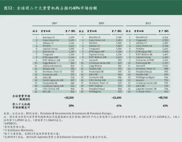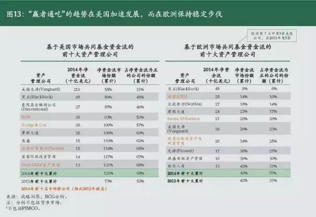 除不同子行业发展快慢不均外,我们从全球市场还观察到一个通行的趋势——资产管理市场“赢者通吃”现象明显。全球资产管理业务的发展经验指出资产管理是一项需要规模效应的业务,成功机构往往在某些特定领域建立规模效应。全球前20大资产管理机构管 理资产规模市场份额合计2007年为38%,2009年为41%,2013年为42%,20家机构即占据 全球市场近一半(参阅图12)。如果看增量,则这一趋势更加明显。例如,美国前十大共 同基金管理规模2014年的增量达到了美国共同基金市场整体增量的121%(除前十大机构以 外的其他机构增量合计为负数),而这一数字在2013年只有73%,也就是说前十大机构对 市场增量的贡献大大提高。在欧洲,这一趋势则趋于稳定,同样是前十大共同基金管理规 模2014年增量占市场总体的比重,欧洲2014年和2013年的比重均为42%。(参阅图13)