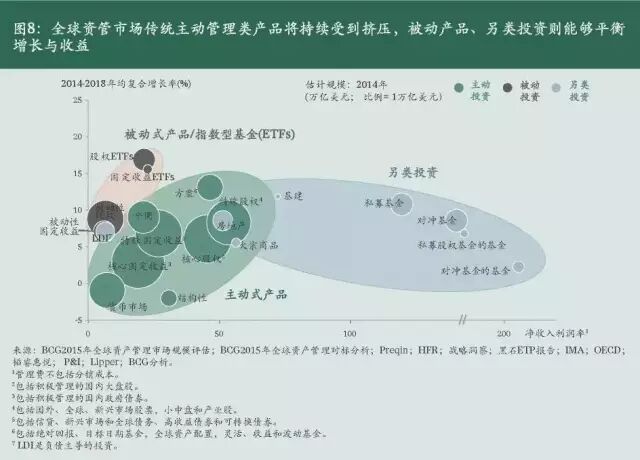 预计未来三年,传统主动类产品将受到持续挤压(参阅图8)。如图所示,横轴表示 产品的净收入利润率(净收入利润率=管理费收入-分销成本),纵轴表示产品2014-2018年 的年均复合增长率。被动型产品预计增速最快;另类投资产品由于投资门槛较高,难以获 得规模上的快速增长,但仍将通过提供较高的投资回报,获得稳定的市场份额;而主动型产品无论是增速还是利润率都将受到持续挤压。