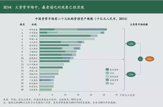 中国资管市场中,“赢者通吃”的现象也已经显现。前十大资管机构管理资产规模市 场份额总计32%,前20大资管机构市场份额总计44%,集中度与全球资管市场相近(参阅 图14)。在细分行业中,“赢者通吃”的现象更加明显。例如,根据2014年底数据,中国 前十大银行理财产品余额合计市场份额占比68%;2015年底,前十大公募基金规模合计占 比达57%,前十大基金公司专户规模合计占比达49%,前十大基金子公司专户规模合计占 比达48%,前十大券商资管规模合计占比50%。(参阅图15)