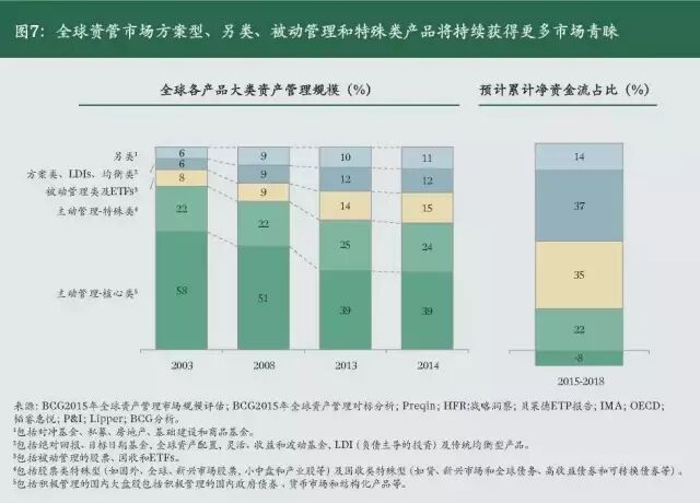 从全球来看,2014年全球资管市场的投资品类依然在从主动管理型的核心类向被动管理型,以及另类投资产品倾斜。主动管理型中最传统的核心类产品规模占比从2003年的58%下滑至2014年的39%,而被动管理型(含ETFs)、方案类1(含LDI和均衡类)及另类1方案类:包括绝对回报、目标日期基金、全球资产配置、灵活收益和波动基金等。投资产品则分别上涨了7%、6%和5%的市场份额(参阅图7)。这样的变化趋势反映出客户对产品收益、多元化投资组合和低费率产品的综合偏好。