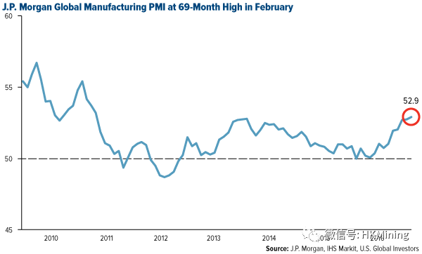 全球制造业活动已经连续六个月实现扩张,对于未来的大宗商品需求来说是个积极信号。2月份全球采购经理指数达到52.9点,创69个月新高,其中美国和欧元区显露出强劲信号。