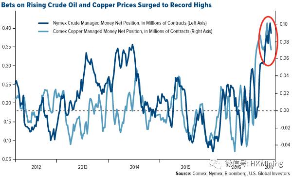 同时,对冲基金经理显著提高了押注铜和油价还有大量上涨空间的仓位。据彭博社报道,纽约商品交易所及纽约商业交易所铜和原油的净多头仓位已经飙升至历史最高水平。