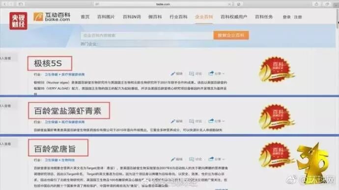 比如说,有一个词条名叫“极藻5s”,号称一位肝癌患者服用“极藻5s”仅仅7天,癌细胞就不见了,该产品一经发布月售上万盒,但如此神奇的产品,在国家食品药品监督管理总局网站上却查不到任何相关信息。而一位号称获取“国家医学进步奖”的中医,其实就在陕西渠子村的一家小诊所,而且没有行医资质......