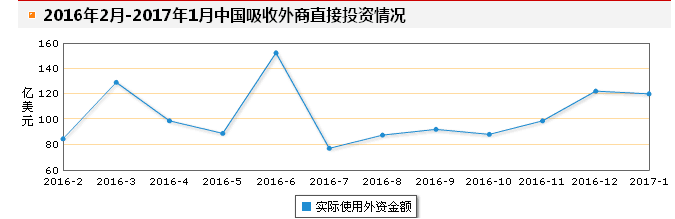 中国吸引外资开年也遭遇下滑。2017年1月,实际使用外资金额801亿元人民币(约合120亿美元),同比下降9.2%。