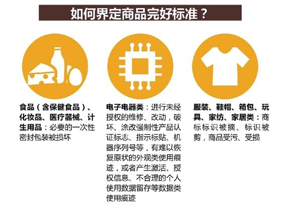 《办法》对商品完好的内涵和标准进行了界定:商品能够保持原有品质、功能,商品本身、配件、商标标识齐全的,视为商品完好。