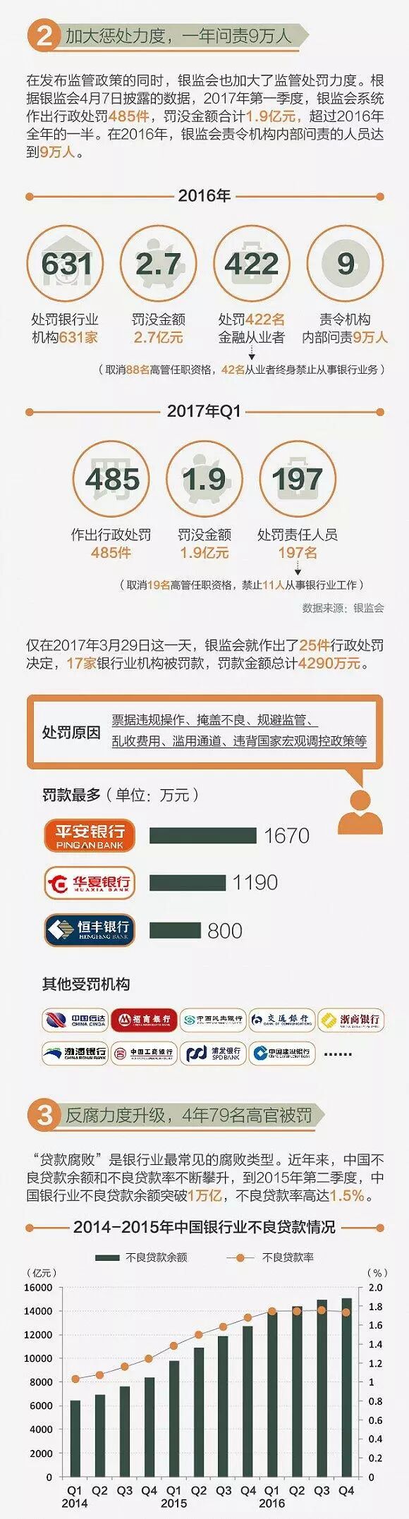 2017年第一季度,银监会系统作出行政处罚485件,罚没金额合计1.9亿元。在2016年,银监会责令机构内部问责的人员达到9万人。