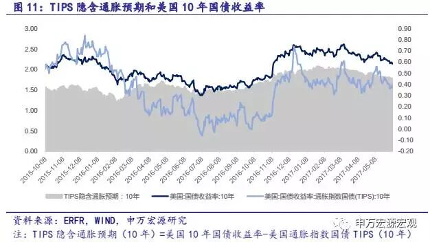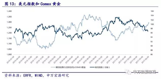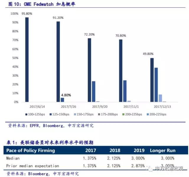 从5月份议息会议的经济预测以及利率点阵图来看,对比3月份的会议情况,利率点阵图显示利率2017年加息路径不变,美联储对经济前景整体乐观。预计2017年加息两到三次。本周非农公布后,虽数据不佳,但CME显示6月利率达到100-125bp的概率上涨为95.8%,离议息会议还有两天,历史数据来看,如此高的加息概率,市场对美联储加息决策基本已经price in,我们提醒投资者堤防美联储没有如期加息的风险。