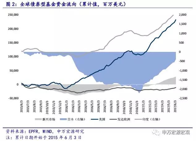 6月7日当周,美国、日本股票型基金分别净流出44.54亿美元和12.67亿美元。发达欧洲、新兴市场和印度继续最近两月以来的净流入态势,当周净流入资金分别为21.75亿美元、15.41亿美元和2.40亿美元。债券型基金美国、日本、发达欧洲、新兴市场和印度均呈现净流入,分别为102.63亿美元、1.58亿美元、23.01亿美元、26.10亿美元和0.99亿美元。英国股债均呈现流入状态,净流入资金分别为1.68亿美元和4.43亿美元。资金净流入全球大宗商品、全球债券市场、全球货币市场基金以及能源板块,从地产板块流出。