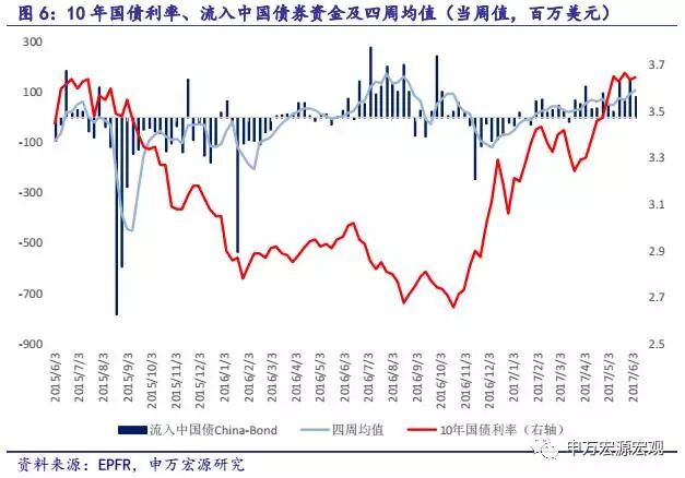 6月7日当周,约有0.83亿美元资金流入中国债市,连续12周呈现资金的净流入,10年期国债利率小幅上涨1.1个bp至3.648%。