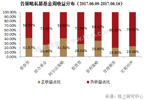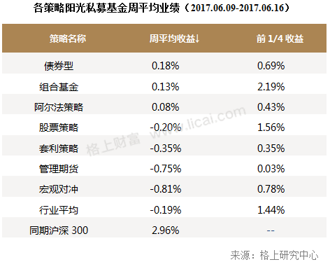 本周市场以震荡修整为主,其中上证综指上涨1.11%,创业板指数微跌0.14%。从各策略的业绩表现来看,上周(2017.06.09-2017.06.16)债券策略、阿尔法策略和组合基金取得了正收益,其余策略为负收益,其中债券策略获得最高的周度收益,为0.18%,而宏观对冲策略垫底,上周收益为-0.81%。