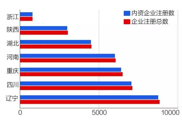 第三批自贸试验区带动了一大批新增企业的设立。据不完全数据统计显示,截至2017年6月底,在7个自贸试验区中,辽宁自贸试验区企业注册总数首屈一指,达到8817家;四川自贸试验区排名第二,新增注册企业数8000余家;浙江自贸试验区在企业注册数量上与其他自贸试验区差异巨大,仅为803家。在企业注册类型上,内资企业注册数量占各个自贸试验区的绝大部分,外资企业注册数所占比重较小。