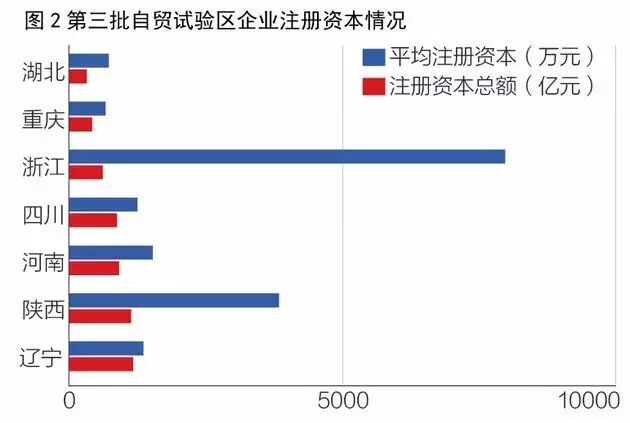 这表明虽然浙江自贸试验区新增企业数目不多,但其注册资本普遍较大,极可能是行业内的一些龙头企业入驻。相较而言,其他自贸试验区特别是重庆、湖北等其自贸试验区入驻企业的注册资本额度相对偏小。