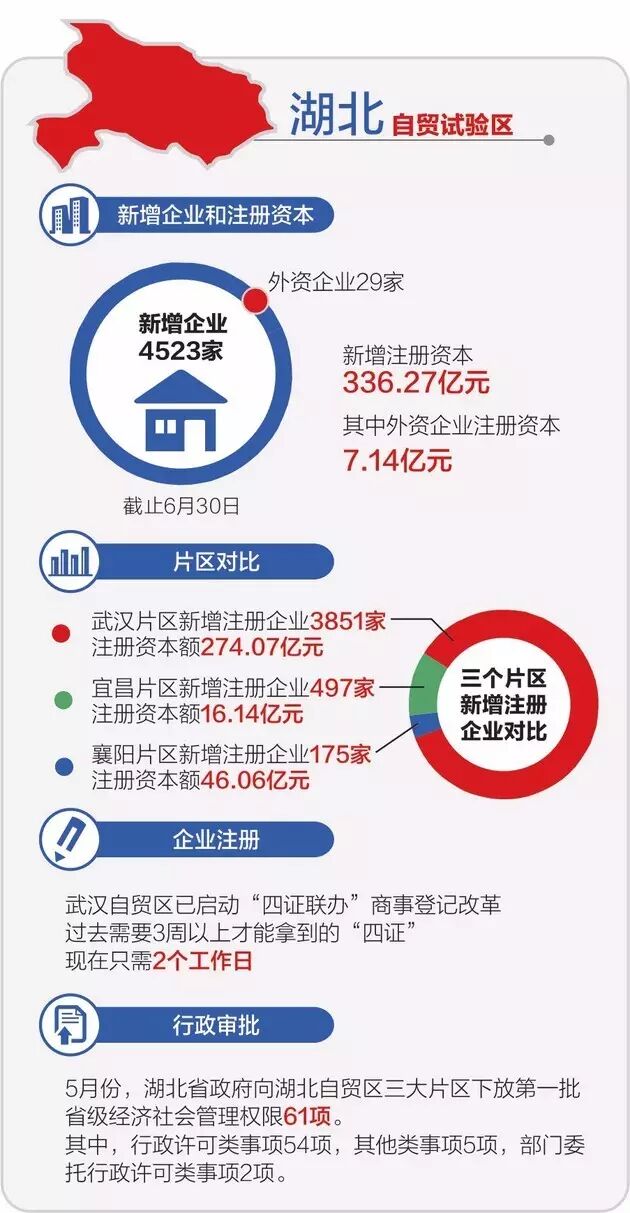 记者从湖北省商务厅获悉,从挂牌至6月30日,湖北自贸试验区新增注册企业4523家,总注册资本336.27亿元。分片区来看,武汉片区新增注册企业3851家,注册资本274.07亿元,平均每个工作日诞生55家公司。