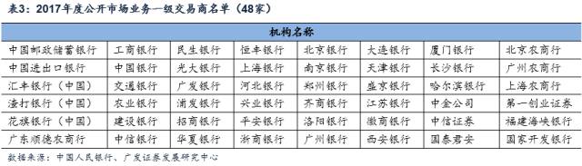 根据考评结果公布公开市场业务一级交易商名单。近两年公布的一级交易商都是48家,与2016年相比,2017年去掉了宁波银行、杭州银行、贵阳银行和富滇银行4家银行,新增了中国进出口银行、长沙银行、哈尔滨银行和广东顺德农村商业银行,总数量与去年持平。