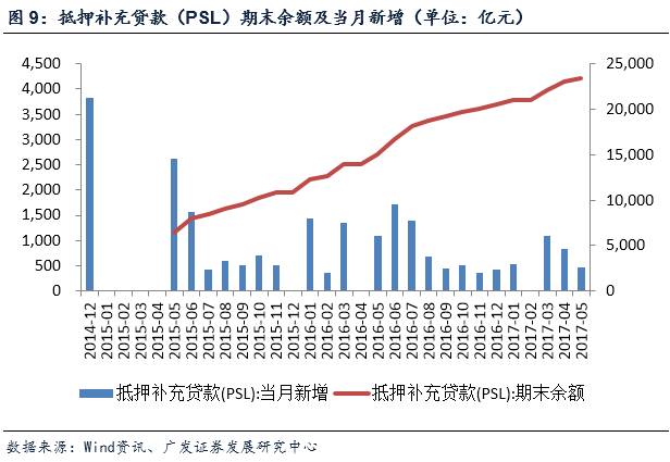 PSL创设至今,央行基本上每月都会投放。2017年5月,人民银行对国家开发银行、中国进出口银行、中国农业发展银行三家银行净增加抵押补充贷款共476亿元,5月末抵押补充贷款余额为23473亿元。