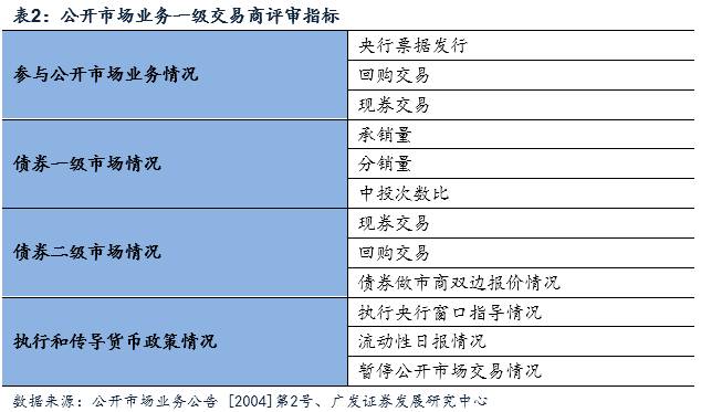 中国人民银行从1998年开始建立公开市场业务一级交易商制度,选择了一批能够承担大额债券交易的商业银行作为公开市场业务的交易对象。近年来,该制度不断完善,一级交易商的机构类别也从商业银行扩展至证券公司等其它金融机构。央行每年都会根据公开市场业务一级交易商考评调整机制(公开市场业务公告[2004]第2号),对公开市场业务一级交易商及其他全国银行间债券市场成员进行考评。公开市场业务一级交易商评审指标包括四大类:参与公开市场业务情况、债券一级市场情况、债券二级市场情况以及执行和传导货币政策情况(如表2)。