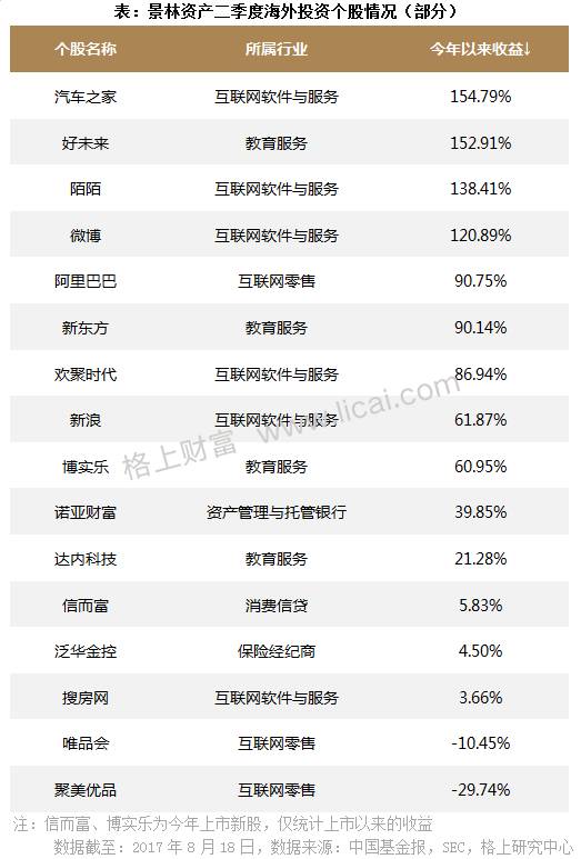 另一方面,二季度景林资产清仓退出了百济神州、易车、途牛和迅雷等4只股票,较大幅度减持阿里巴巴、汽车之家、搜房网、聚美、诺亚、新浪、好未来、唯品会和欢聚时代等9只股票。