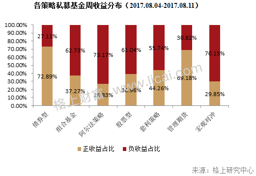 从各策略的业绩表现来看,上周(2017.08.04-2017.08.11)整体表现较差,仅管理期货与债券型获得正收益,管理期货表现明显好于其他策略,获得了最高的周度收益,为0.74%。而其他策略表现较差,其中宏观对冲策略连续三周垫底,收益为-1.05%,正收益比仅为29.85%。
