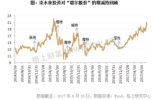 格上研究中心发现,截至8月18日,从已公布中报的公司来看,淡水泉投资与“国家队”喜好最接近,其与“国家队”共同心水的个股达5只。其中,淡水泉投资持有时间最久的个股是“歌尔股份”,从2014年四季度开始新进该股前十大流通股东后,淡水泉投资陆续对其进行了增减持。值得注意的是,格上研究中心发现,淡水泉对“歌尔股份”的增减持操作时点充分体现出其“逆向投资”的投资理念。格上研究中心了解到该团队更喜欢在被市场“忽略”和“冷落”的地方去“淘金”,越是不被看好的投资,淡水泉越是加强对其基本面的研究,以期先于市场发现投资机会。