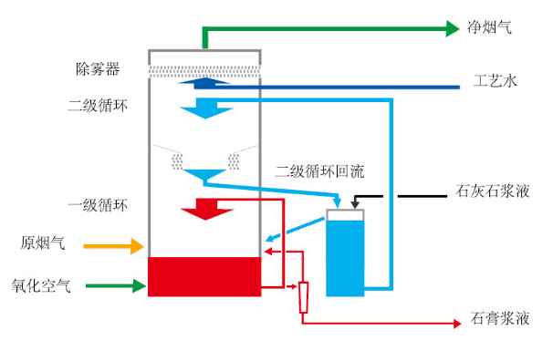该技术相当于烟气通过了两次独立的SO2脱除过程,烟气进入吸收塔首先与下循环喷淋装置喷出的浆液逆向接触,脱除大部分SO2;再通过集液斗的导流叶片进入上循环区,进一步脱除剩余的SO2。这两个循环回路可以实现不同的PH值运行,实现SO2的超低排放。