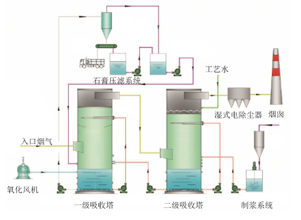双塔双循环技术是单塔双循环技术的发展和延伸,非常适用于高含硫煤和高脱硫效率的改造工程,能有效低利用原有的脱硫装置,避免了重复建设和资源浪费。烟气首先经过一级循环,其脱硫效率一般在50%-70%。此循环的主要功能是保证优质的亚硫酸钙氧化效果,以及充足的石膏结晶时间。经过一级循环的烟气直接进入二级循环,该级循环主要是脱硫洗涤过程。两级综合脱硫效率可达99%以上。