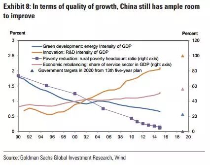 平衡的四个方面:绿色发展(蓝色线,经济增长单位能耗,左轴);创新(黄色线,研发投入占GDP的比重,左轴);扶贫(紫色线,贫困人口占比,右轴);产业结构(红色线,第三产业占GDP的比例,右轴);右端三角形为中国政府设定的2020年目标。(数据来源:高盛、万得)
