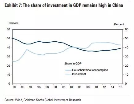 中国消费(深色线)和投资(浅色线)占GDP的比重变化(数据来源:万得、高盛)