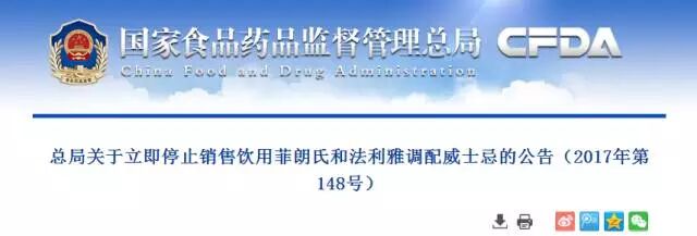 国家食药监总局25日发布公告,要求立即停止销售饮用菲朗氏和法利雅调配威士忌。