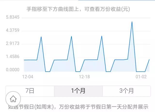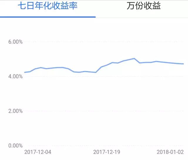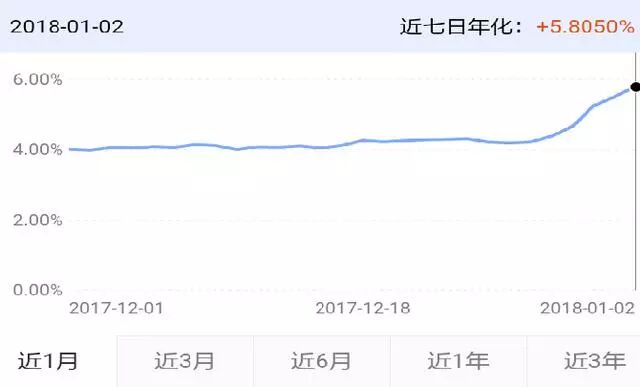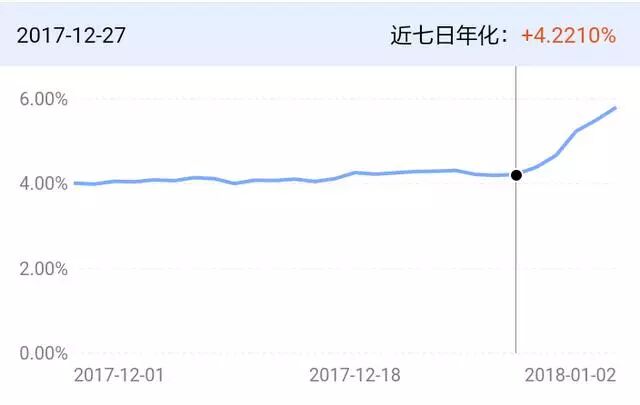 4、上图在你查看的时候7日年化收益率高达,5.8%,而在即几天前一直稳定在4.2%左右,也是说近几天是处在不正常期,以后很可能回到4.2%左右。收益可能不如年化4.5%左右的。