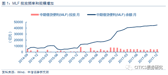 截至2017年12月,MLF余额已经达到45215亿元。MLF作为央行中长期流动性投放的主要工具,除了保持银行体系流动性总体平稳适度,支持货币信贷合理增长的作用外,其操作利率也发挥着中长期政策利率的作用,通过调节向金融机构中期融资的成本来对金融机构的资产负债表和市场预期产生影响,最终引导长端利率的走势。