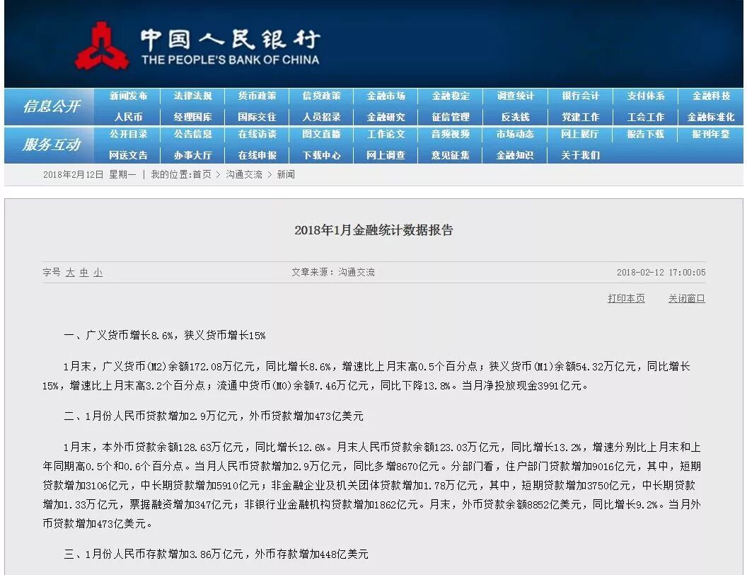 2018年1月金融统计数据报告 一、广义货币增长8.6%,狭义货币增长15% 1月末,广义货币(M2)余额172.08万亿元,同比增长8.6%,增速比上月末高0.5个百分点;狭义货币(M1)余额54.32万亿元,同比增长15%,增速比上月末高3.2个百分点;流通中货币(M0)余额7.46万亿元,同比下降13.8%。当月净投放现金3991亿元。 二、1月份人民币贷款增加2.9万亿元,外币贷款增加473亿美元 1月末,本外币贷款余额128.63万亿元,同比增长12.6%。月末人民币贷款余额123.03万亿元,同比增长13.2%,增速分别比上月末和上年同期高0.5个和0.6个百分点。当月人民币贷款增加2.9万亿元,同比多增8670亿元。分部门看,住户部门贷款增加9016亿元,其中,短期贷款增加3106亿元,中长期贷款增加5910亿元;非金融企业及机关团体贷款增加1.78万亿元,其中,短期贷款增加3750亿元,中长期贷款增加1.33万亿元,票据融资增加347亿元;非银行业金融机构贷款增加1862亿元。月末,外币贷款余额8852亿美元,同比增长9.2%。当月外币贷款增加473亿美元。 三、1月份人民币存款增加3.86万亿元,外币存款增加448亿美元 1月末,本外币存款余额173.27万亿元,同比增长10.3%。月末人民币存款余额167.97万亿元,同比增长10.5%,增速分别比上月末和上年同期高1.5个和0.1个百分点。当月人民币存款增加3.86万亿元,同比多增2.38万亿元。其中,住户存款增加8676亿元,非金融企业存款增加221亿元,财政性存款增加9809亿元,非银行业金融机构存款增加1.59万亿元。月末,外币存款余额8357亿美元,同比增长15.1%。当月外币存款增加448亿美元。 四、1月份银行间人民币市场同业拆借月加权平均利率为2.78%,质押式债券回购月加权平均利率为2.88% 1月份银行间人民币市场以拆借、现券和回购方式合计成交80.19万亿元,日均成交3.65万亿元,日均成交比上年同期增长44.9%。其中,同业拆借日均成交同比增长50.3%,现券日均成交同比增长48.2%,质押式回购日均成交同比增长42.7%。 1月份同业拆借加权平均利率为2.78%,比上月末低0.13个百分点,比上年同期高0.42个百分点;质押式回购加权平均利率为2.88%,比上月末低0.23个百分点,比上年同期高0.4个百分点。 五、1月份跨境贸易人民币结算业务发生3632.3亿元,直接投资人民币结算业务发生2157.4亿元 2018年1月,以人民币进行结算的跨境货物贸易、服务贸易及其他经常项目、对外直接投资、外商直接投资分别发生2813.7亿元、818.6亿元、954.9亿元、1202.5亿元。 注1:当期数据为初步数。 注2:2018年1月,人民银行完善货币供应量中货币市场基金部分的统计方法,用非存款机构部门持有的货币市场基金取代货币市场基金存款(含存单)。完善后,本期M2余额扩大1.15万亿元,去年同期M2余额扩大8249亿元,数据可比;本期M2余额同比增长8.6%,2017年末M2余额同比增长8.1%。按完善前方法统计,2018年1月末M2增速为8.5%。 注3:自2014年8月份开始,转口贸易被调整到货物贸易进行统计,货物贸易金额扩大,服务贸易金额相应减少。 注4:自2015年起,人民币、外币和本外币存款含非银行业金融机构存放款项,人民币、外币和本外币贷款含拆放给非银行业金融机构的款项。 2018年1月社会融资规模存量 统计数据报告 初步统计,2018年1月末社会融资规模存量为177.6万亿元,同比增长11.3%。其中,对实体经济发放的人民币贷款余额为121.7万亿元,同比增长13.2%;对实体经济发放的外币贷款折合人民币余额为2.46万亿元,同比下降6%;委托贷款余额为13.89万亿元,同比增长2.9%;信托贷款余额为8.59万亿元,同比增长30.2%;未贴现的银行承兑汇票余额为4.58万亿元,同比增长1.5%;企业债券余额为18.51万亿元,同比增长3.5%;非金融企业境内股票余额为6.7万亿元,同比增长13.6%。 从结构看,2018年1月末对实体经济发放的人民币贷款余额占同期社会融资规模存量的68.5%,同比高1.1个百分点;对实体经济发放的外币贷款余额占比1.4%,同比低0.2个百分点;委托贷款余额占比7.8%,同比低0.7个百分点;信托贷款余额占比4.8%,同比高0.7个百分点;未贴现的银行承兑汇票余额占比2.6%,同比低0.2个百分点;企业债券余额占比10.4%,同比低0.8个百分点;非金融企业境内股票余额占比3.8%,同比高0.1个百分点。 注1:社会融资规模存量是指一定时期末(月末、季末或年末)实体经济(境内非金融企业和个人)从金融体系获得的资金余额。 注2:数据来源于人民银行、证监会、保监会、中央国债登记结算有限责任公司和银行间市场交易商协会等部门。 注3:社会融资规模中的本外币贷款是指一定时期内实体经济从金融体系获得的人民币和外币贷款,不包括银行业金融机构拆放给非银行业金融机构的款项和境外贷款。 注4:2015年1月起,委托贷款统计制度进行了调整,将委托贷款划分为现金管理项下的委托贷款和一般委托贷款。社会融资规模中的委托贷款只包括由企事业单位及个人等委托人提供资金,由金融机构(即贷款人或受托人)根据委托人确定的贷款对象、用途、金额、期限、利率等向境内实体经济代为发放、监督使用并协助收回的一般委托贷款。 注5:当期数据为初步统计数,同比增速为可比口径数据。 2018年1月社会融资规模增量 统计数据报告 初步统计,2018年1月份社会融资规模增量为3.06万亿元,比上年同期少6367亿元。其中,当月对实体经济发放的人民币贷款增加2.69万亿元,同比多增3717亿元;对实体经济发放的外币贷款折合人民币增加266亿元,同比多增140亿元;委托贷款减少714亿元