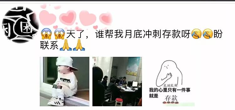 言简意赅的文字表达:天了,表达出了作者的惊恐之情;谁帮我月底冲刺存款呀,表达了作者的迫切需求;盼联系,表达了作者的满怀期盼。