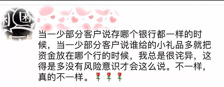 一问一答之间,一段真实的客户与银行人的对话,硬是让他活生生写成了段子有木有!啥?有存款?那我还下什么班?那我还回什么家?那我还吃什么饭?本来上了一天班一身疲倦,听到有存款,两眼放光,精神抖擞,犹如打了鸡血一般,只要客户一声召唤,你稍等一下下,我马上就到!