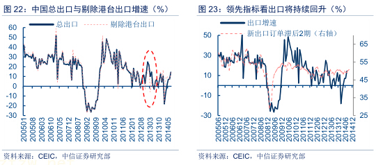 需要说明的问题一:截至 7 月数据,未见出口项下贸易监管强度的放松。贸易监管保持强度,出口项下的虚假贸易持续受到抑制。7 月,对香港和台湾出口增速分别为 13.3%和48.4%,同比增速较前期略有反弹,主要归因于基数影响。剔除对香港和台湾出口之后的增速(14%)与总出口增速(14.5%)大体一致,这与去年上半年的情况有所不同,2013 年上半年这两个指标发生了显著的偏离。而且,6 月海关公布的出口先导指标为 42.2,为近两年来的次高点;6、7 两个月官方 PMI 新出口订单指数均处于 50%以上(50.3%和 50.8%),7 月出口数据与上述领先指标的指向相吻合。因而我们判断 7 月出口增速的回升反映了外需改善、而非热钱流入。