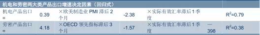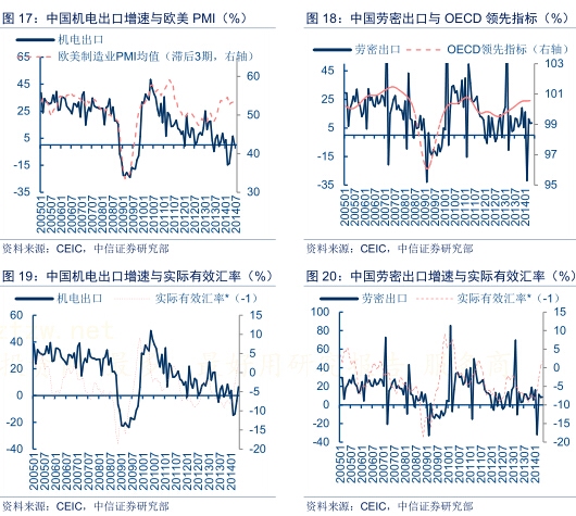 中国出口给哪些国家和地区——机电产品出口终端需求在 G3,劳密产品出口目的地则更为分散。机电产品受全球制造业产业链条驱动,终端需求在 G3 国家,对 G3 机电产品出口占比为40.7%,计入港台机电出口后(通常通过转口贸易指向 G3 国家),占比提升至62.9%,机电出口增速与欧美加权的 PMI 走势高度相关(领先 2 个月的相关系数达到 0.73)。而受益于中国出口多元化战略,中国对东盟、金砖以及其他新兴经济体的劳密产品出口实现快速增长,占比逐年提升,目前合计占比达到 46.4%,与对 G3 劳密出口占比大致相当(44.3%)。在金融危爆发后的几年间,新兴经济体对中国总出口增速形成有力支撑。也就是说,与机电产品出口相比,劳密产品出口受到更为广泛的国家和地区的收入增长驱动,终端需求相对分散,因而增速相对平稳。劳密出口增速与 OECD 领先指数走势高度相关(领先 1 个季度的相关系数为 0.5)。