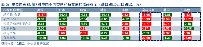 劳密出口将逐步回调至个位增长。金砖国家以及“其他国家和地区”对中国进口需求的依赖度高,且集中在动植物、食品、矿产化工、劳密产品以及杂项制品等非全球化生产的产品上,上述品类的进口更多依赖中国内需而非“因出口而引致的进口需求”。中国需求升级和产能去化对金砖及“其他国家和地区”的复苏形成抑制,反过来抑制“金砖”、“其他国家地区”的进口需求和中国自身的劳密产品出口(占劳密总出口的 35.4%)。