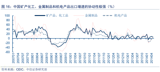 中国出口哪些大类商品——中国矿产化工、金属制品和机电产品出口占比超七成,劳动力密集型产品出口占比接近两成。其中,矿产化工、金属制品和机电产品出口增速具有极强的周期性,且三类产品出口增速之间的相关系数接近或超过 0.9,表明三者之间有极强的协动性,因此我们可以将研究重点聚焦于机电产品出口上。机电产品出口占中国总出口额的比重在一半以上(50.4%),矿产化工和金属制品出口占比分别为 10.8%和 12.0%,三大类别产品解释了中国出口增速的绝大部分波动。而从产品角度来看,划归劳动密集型产品的出占总出口的比重为 17.8%。需要指出,如果从生产角度来看,这一比例会更高,因为在商品的全球化生产过程中,中国往往处于劳动力密集型的生产环节,一个划归机电类出口的产品,在中国的生产过程可能划归劳动力密集型出口。(生产角度的分类方法参见《中国经济专题20120321:中国出口之行业图景》)