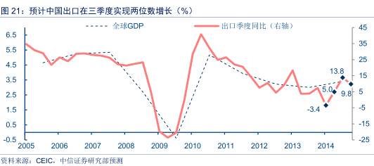 出口金秋提速。7 月出口先导指标继续提升,PMI 新出口订单指数处于扩张区间,预示出口将延续改善趋势。进口方面,中国经济在 2 季度企稳,进口需求将随之驱稳,进口项下虚假贸易水分被挤出后,该因素对进口增速的拖累不再加码,未来进口增速将略有回升。预计 3 季度出口增速由5%回升至 12.7%,进口由 1.5%回升至 4.2%,贸易顺差在千亿美元左右。