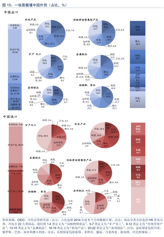 中国出口哪些大类商品、出口给哪些地区。机电出口占中国总出口的一半(50.4%);矿产化工、金属制品出口占比分别为 10.8%和 12.0%,三类产品解释了出口增速的绝大部分波动;传统劳密出口占比 17.8%。分国别,对 G3 机电出口占比 40.7%,计入港台后,占比提升至 62.9%。而受益于多元化战略,中国对东盟、金砖及其他新兴经济体的劳密出口合计占比46.4%,与对 G3 劳密出口占比大致相当(44.3%)。即与机电出口相比,劳密出口受更广泛的国家和地区收入增长驱动,终端需求分散。