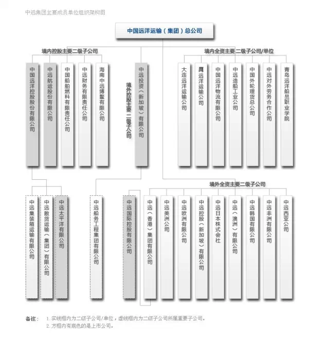 目前,中远已形成以北京为中心,以香港、美洲、欧洲、新加坡、日本、澳洲、韩国、西亚、非洲等九大区域公司为辐射点的全球架构,在50多个国家和地区拥有千余家企业和分支机构,员工总数13.5万人,其中境外员工4600多人,资产总额超过3300亿元人民币,海外资产和收入已超过总量的半数以上。下图为中远的组织架构图。
