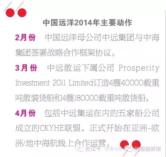 对此,中国远洋明确表示,2014年将继续聚焦集装箱运输和散货运输两大业务,着力推进航运主业效益攻坚。在集装箱运输方面,将继续优化船队结构,深化全球网络营销,努力开拓新兴市场;进一步加强成本管控,提升资源配置能力和使用效率;扩大联盟合作,形成新的联盟运作机制。作为深化联盟合作的重要一步,今年4月份,中远集运联合川崎汽船、阳明海运、韩进海运、长荣海运等共同成立的CKYHE联盟,已在亚洲-欧洲/地中海航线上合作运营。在此前的2月份,中国远洋母公司中远集团还与中海集团签署了战略合作框架协议,宣布两大央企将联手应对市场挑战。干散货运输方面,中国远洋将继续贯彻大客户战略,提高基础货源比例;发挥外部协同作用,积极推进横向联盟;优化结构,统筹运力拆旧造新计划,平稳适时更新船队。