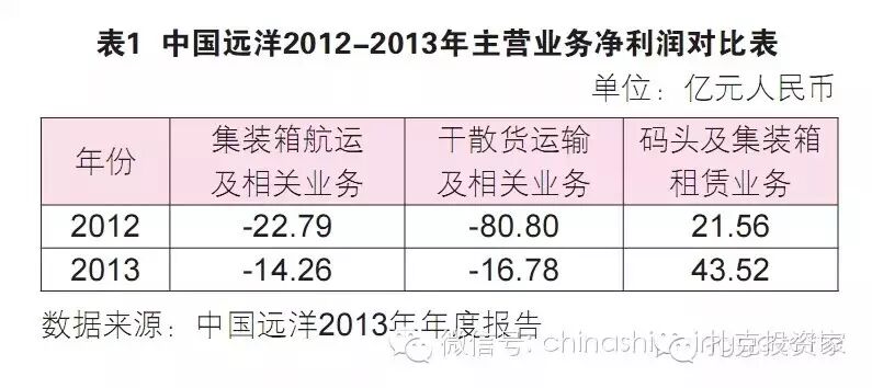 中国远洋2013年年度报告显示,2013年共实现营业收入619.34亿元,同比减少14.07%。按业务板块划分,集装箱运输及相关业务收入425.35亿元,同比下降1.51%,净利润-14.26亿元,比2012年减亏超过8亿元;干散货运输及相关业务收入为140.7亿元,同比下降12.59%,净利润-16.78亿元,与2012年亏损超过80亿元相比,大幅减亏;码头和租赁业务则贡献了净利润约43.52亿元,约为2012年的两倍。